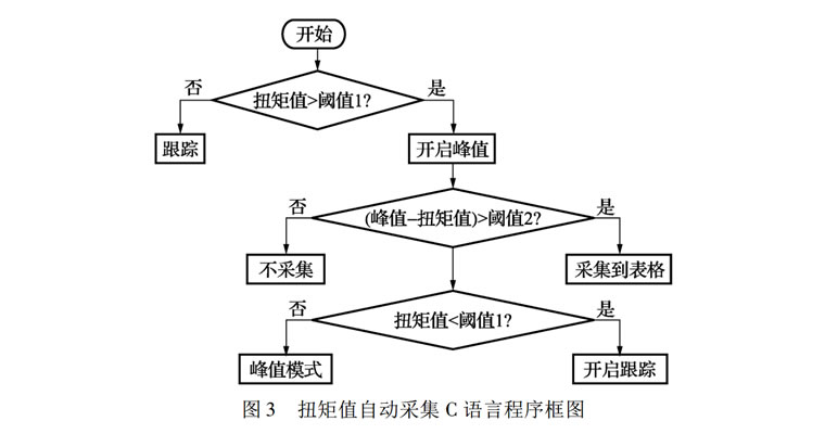 大多數儀表只具有顯示功能不具有數據采集和分析功能,校準人員在校準時,一邊操作校準裝置,一邊用筆記錄校準數據。這樣不但工作效率低還容易出錯。為了方便校準員做記錄,儀表專門設計了數據采集功能,采集表格形式完全按照 JGJ707—2014《扭矩扳子檢定規程》的表格形式[7,這樣方便后面的計算和出證書。儀表采用具有C語言功能的觸摸屏作為顯示終端。校準人員可以通過設定最大扭矩值和采集觸發值, 實現扭矩值的自動采集。并根據采集數據進行平均值和示值相對誤差和示值重復性的計算。C 語言程[8]框圖如圖3 所示。其中閾值1表示進入峰值模式的判斷條件,閾值2表示采集峰值判斷條件。當扭矩值超過閾值 1,儀表自動從跟蹤模式變為峰值模式。當峰值和當前的扭矩值之差大于閾值 2 時,程序會將峰值自動采集到表格中,然后解除峰值功能。閾值1和2的設定根據智能傳感器的量程來計算得到。本設備中閾值1為傳感器滿量程值的5%,閾值2為滿量程值的2/3。