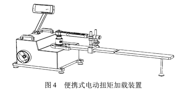 為方便現場檢定使用,整個設備必須方便攜帶。因此檢定裝置的支撐臂采用可折疊式,扭矩傳感器也采用直插式,現場不需任何工具就可以安裝和拆卸加載裝置。智能儀表采用可伸縮支架固定,方便調整角度。整個裝置的結構示意圖如圖 4 所示。因為大部分的現場裝置考慮到電源的問題, 所以多是采用手動加載的方式。這樣在被檢扳手從剛裝上到加上扭矩會有一段空行程, 全部采用手動加載,一方面比較費力,另一方面工作效率也不高。因此,在加載方式上采用手動和電動相結合的方式,裝置中加一個儲能式電機來實現空行程的電動加載,節省人力,提高效率, 當空行程結束傳感器加上力后就可以改成手動加載。