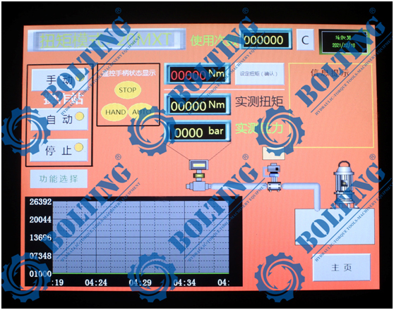 該泵采用防爆電機、防爆控制盒、防爆電器盒、HAWE款防爆電磁閥,通過PLC實現智能控制操作系統,系統多級操作界面,手動自動雙操作模式,系統內囊括所用扭矩范圍的螺栓規格,可預設5個常用扭矩數據,方便直接選取使用,階梯扭矩上升表在操作中觀察一目了然,扭矩未達到系統自動報警提醒再次工作,系統實時保存螺栓緊固和拆卸數據,以便用戶追溯查看。