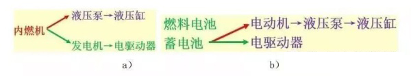 因為,在以內燃機作為能量來源時,雖然內燃機產生的機械能需要經過液壓泵,轉化為液壓能,才能驅動液壓缸,但要驅動電驅動器,也一樣需要通過發電機發電。都有一次能量轉化,電驅動并無特別優勢(圖1a)。而在蓄電池成為能量來源后,電能就是現成的(圖1b)。所以,主機設計師會優先考慮采用電驅動,競爭的格局就會對液壓傳動不利一些。