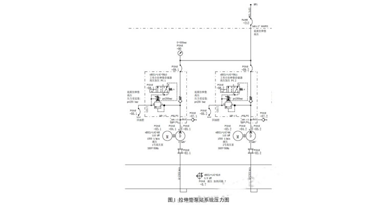拉伸墊泵站由控制油泵、高壓油泵、低壓油泵、循環冷卻泵組成。實際工作中,除開其它原因導致的泵啟動條件不滿足的情況外,系統壓力故障主要有兩種情況,液壓泵損壞和泵出口控制閥損壞。液壓泵或電機損壞直接導致系統無壓力,這種故障查找也非常簡單:啟動液壓泵檢查電機和泵的運行狀態,如果運行正常,泵體和進出油管溫度與油箱溫度接近,說明泵沒有問題;如泵不能啟動,即可排查電機控制電路的熔斷器,如熔斷器正常,即可檢查電機繞組;若出現液壓泵能夠啟動但超負載的現象,需要拆分電機和泵的連接,分別盤車,排查故障是電機還是泵的原因造成。液壓拉伸墊泵站采用先導式溢流閥、換向閥和單向閥的組合,實現系統供油和泵無壓循環功能,如圖 1 所示:拉伸墊動作時系統壓力開關監控到壓力降低至最小工作壓力,就會給出指令到控制溢流閥的換向閥;換向閥得電斷開先導閥回油,溢流閥停止無壓循環開始往系統供油;當系統壓力達到最大工作壓力后換向閥失電,系統開啟無壓循環,單向閥阻止系統油液回流。由于從供油至無壓循環交替的過程中,單向閥也會隨開啟關閉動作,插裝式單向閥關閉時如果進出口壓差過大,閥芯關閉就會沖擊閥體,可能導致閥體碎裂,泵出口油路與回油管直通。若拉伸墊設備在投入使用初期,可能會多次出現單向閥損壞使得系統壓力不能建立故障,這就需要調低先導式溢流閥的開啟壓力即可解決這個問題。而溢流閥的壓力調整可以根據壓力切換時的狀態來調整,可先將壓力調高至單向閥關閉時到出現嚴重撞擊閥體上限,再略微調低壓力,直到單向閥柔和關閉為止。溢流閥壓力調整太低則會導致系統達不到最高壓力而一直供油,油液一直溢流回油箱的現象。