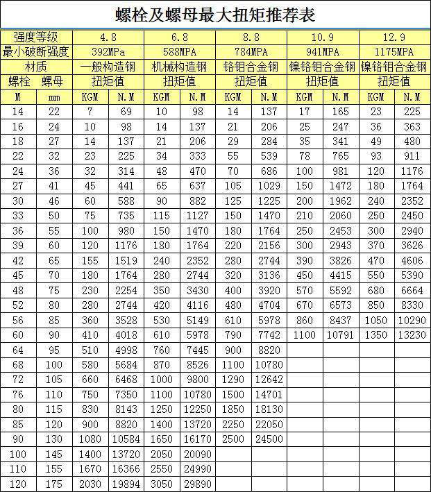 在了解了液壓扳手的分類之后,那么液壓扳手規格型號有哪些?在不同工況下,如何進行液壓扳手選型?大家可以根據現成的扭矩值和空間尺寸進行選型;如果不知道扭矩值,可以根據提供的螺栓規格和螺栓強度等級,參考《螺栓螺母規格與扭矩值推薦表》中的推薦值進行計算選型,具體的大家可以參考下面這張《螺栓螺母規格與扭矩值推薦表》。